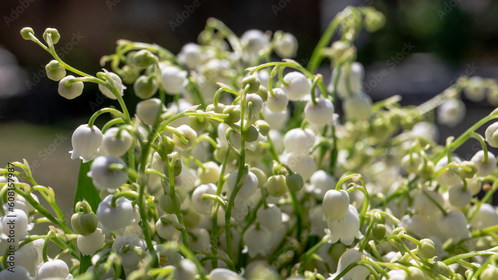 Lilies of the valley on a sunny day, close-up. Horizontal banner