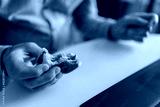 Detail cropped shot of unrecognizable senior older businessman with wrinkle hands eating hamburger with beef from fast food restaurant sitting at table, working online with laptop computer.