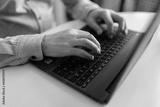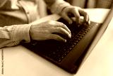 Close-up cropped shot of unrecognizable senior older businessman typing on laptop keyboard. Closeup wrinkly hands of elderly man entrepreneur in home workplace using portable computer sitting at desk.