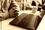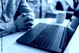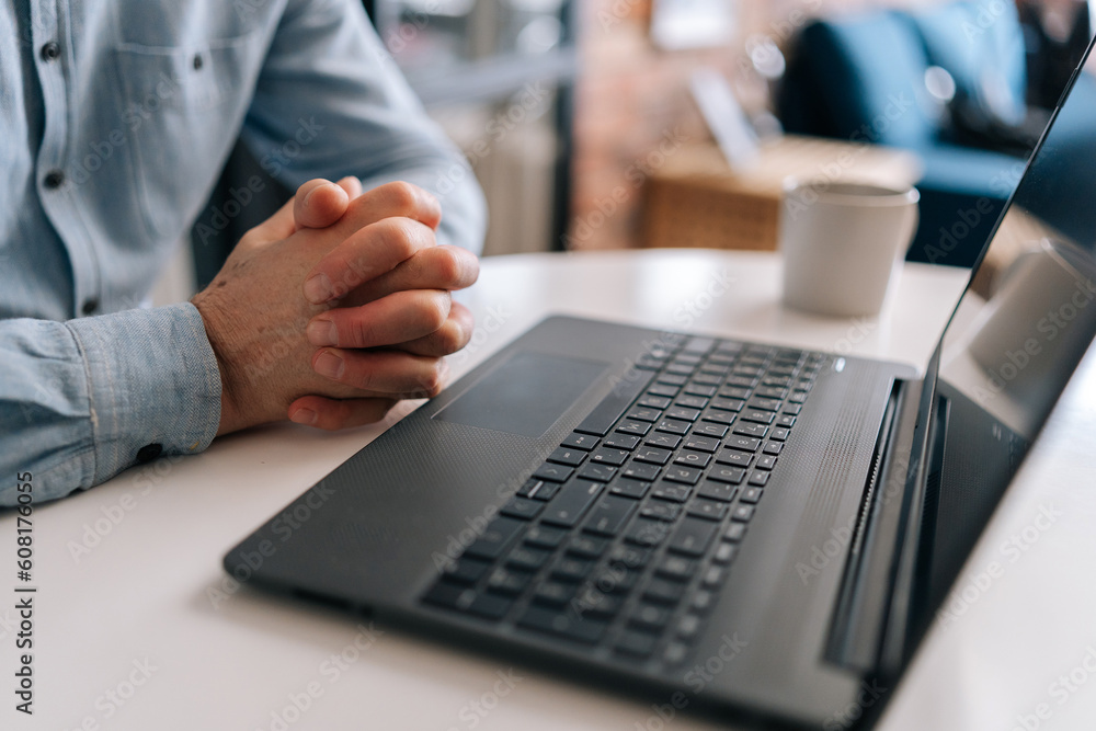 Close-up cropped shot wrinkly hands of unrecognizable nervous mature business man sitting in closed posture, tension or nervous anticipation, determination, thinking of business decision at table.