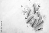 Raw fillet of telapia or pangasius with lemon and spices on a light background. banner, menu, recipe place for text, top view