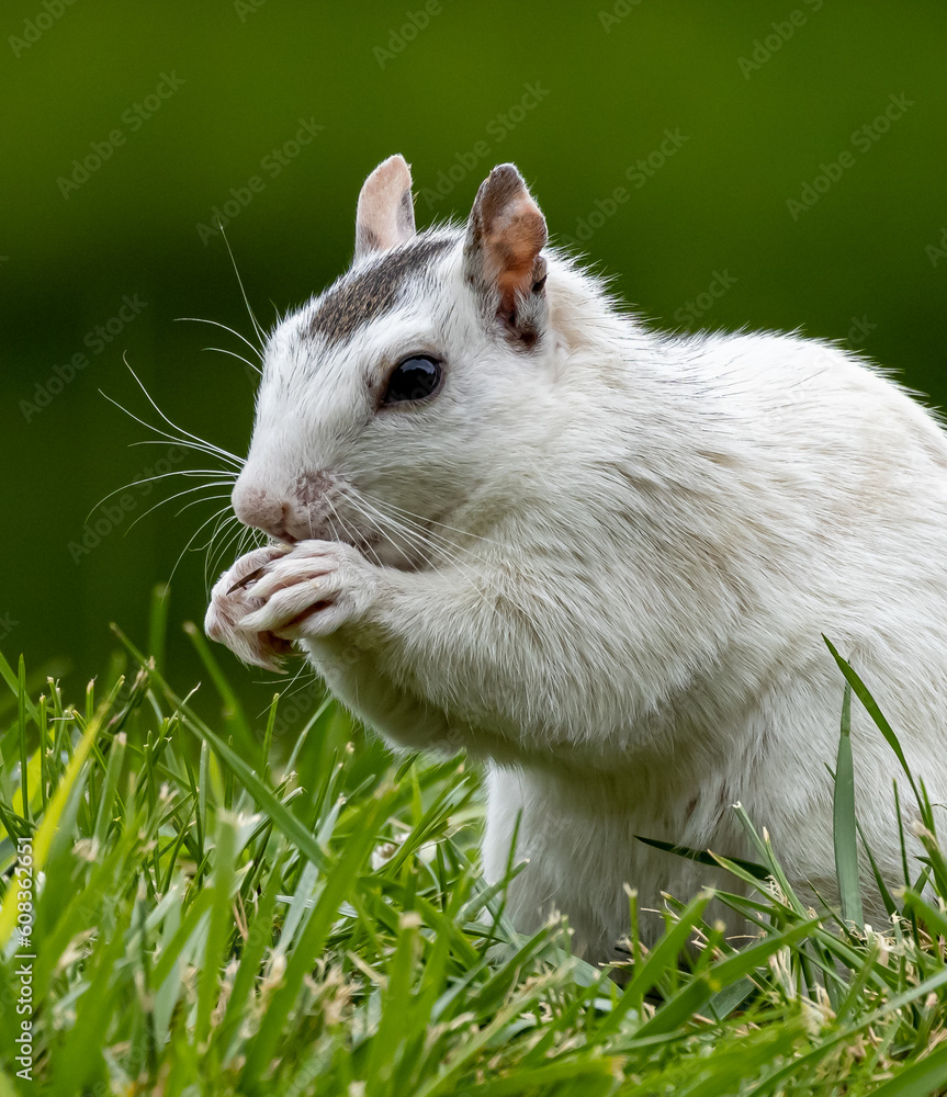 Close up of a rare white squirrel eating while surrounded by green