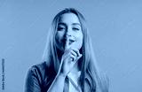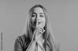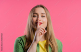 Smiling woman with finger on lips - shhh, secret, silence,pink studio background