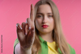 Uninterested woman disapproving with NO finger sign gesture. Attention.