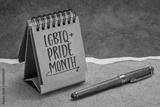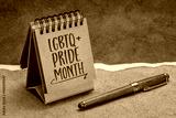 LGBTQ Pride Month - handwriting in a small desktop calendar against abstract paper landscape, reminder of cultural and heritage event