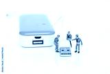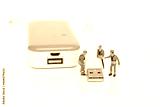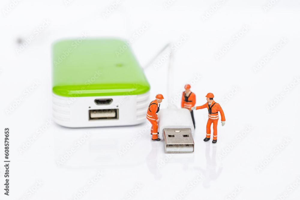 Miniature worker team with USB cable and power bank isolate on white background, energy storage, technology industry