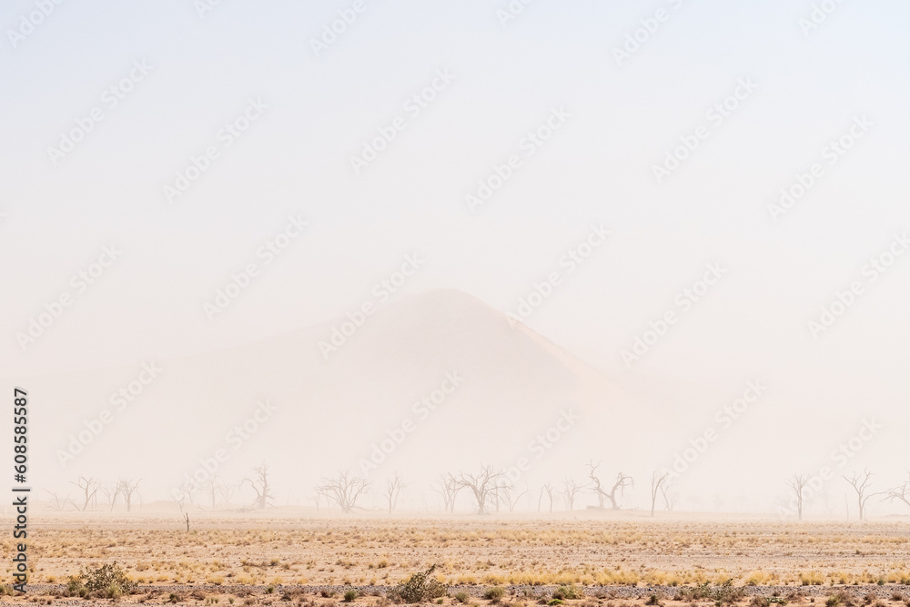 A tree-lined landscape in the Namibia sossusvlei in limited visibility, due to a sandstorm.