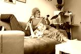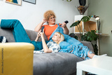Smiling lesbian couple sit on the sofa, embracing each other and using mobile phone at home.