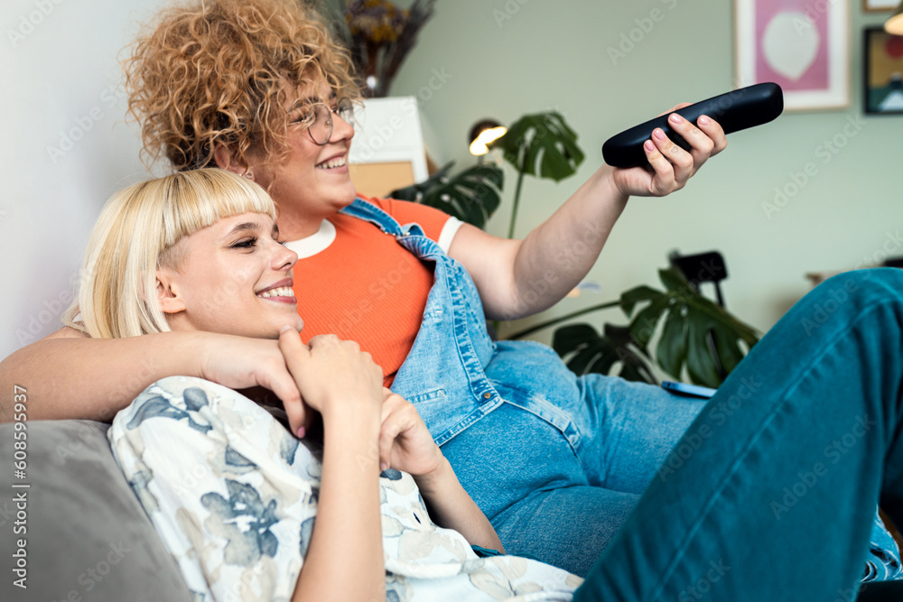 Smiling lesbian couple sit on the sofa, embracing each other and watching tv.