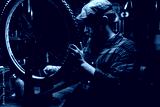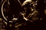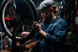 Bearded cycling mechanic male in cup checking bicycle wheel spoke with bike spoke wrench working in repair shop with dark interior. Concept of professional repair and maintenance of bike transport.