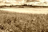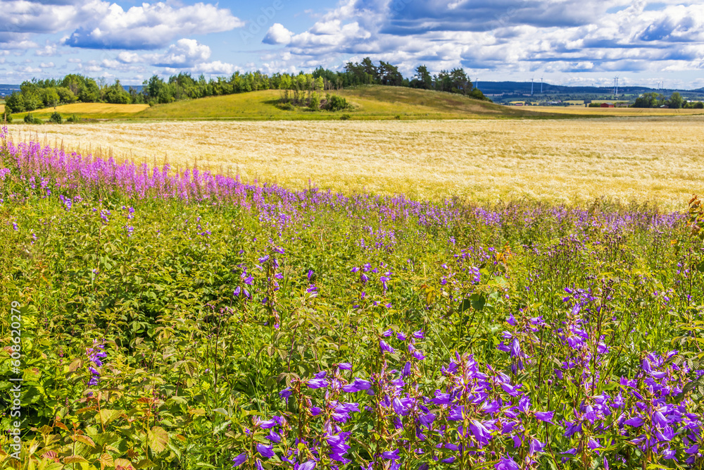 Field with crops in a rural landscape with wildflowers