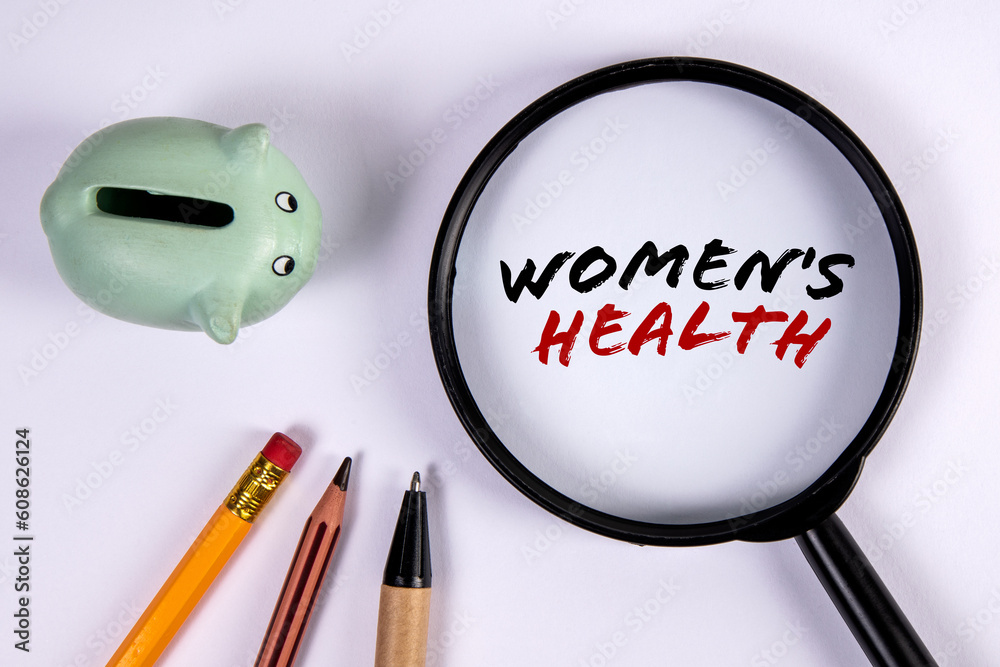 Women's Health. Magnifying glass and piggy bank on white background