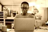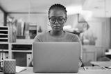 Laptop, office and business black woman typing online for research, internet and browse website. Corporate, professional and female worker busy on computer working on report, project and planning