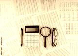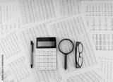 Calculator, magnifying glass, pen, eye glasses on financial statement. Top view.