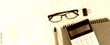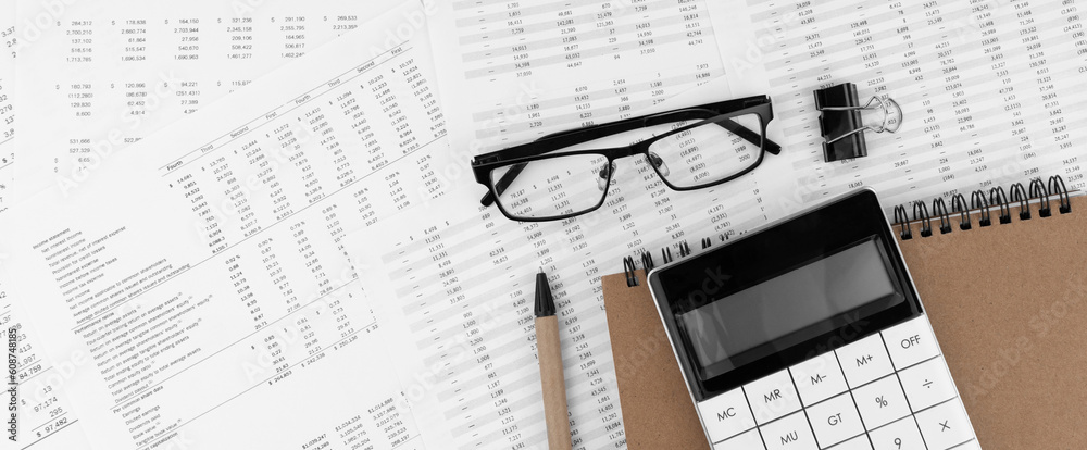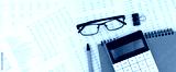 Calculator, pen,notebook and eye glasses lying on financial statement.