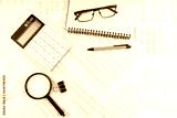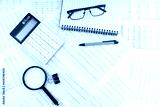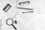Calculator, magnifying glass, pen lying on financial statement. Financial concept. Top view.