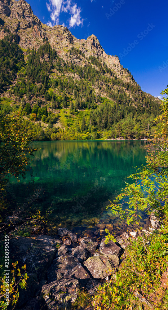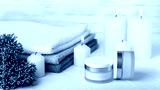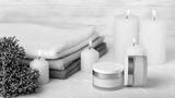 Jars with face cream, burning candles, towels and juniper branch on light background. Concept of calmness, comfort, spa treatments. Selective focus