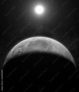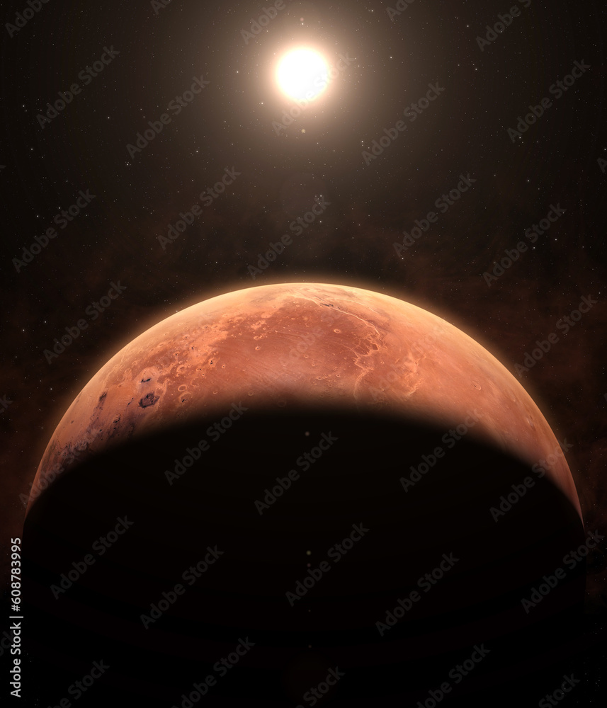 Planet Mars, nebula, galaxy and Sun. The planet Mars appearing from the darkness of outer space. Elements of this image furnished by NASA.