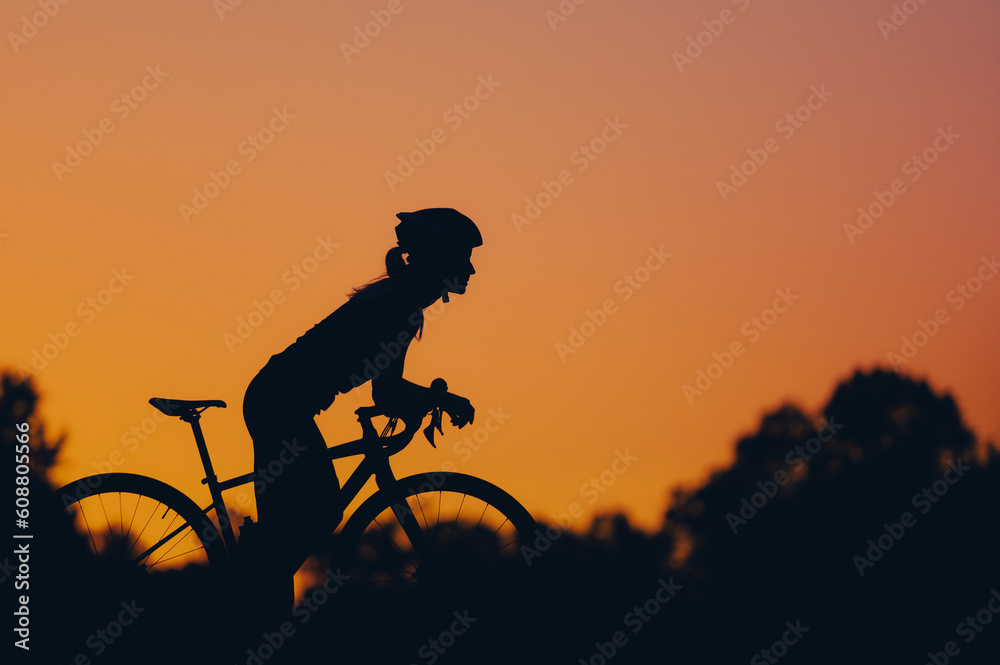 Silhouette of a woman riding a bike during a sport cycling race on a sunset