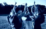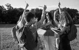 Group of school children learning about nature during outdoor lesson. Smiling teacher asks questions about environment. Students standing on green grass meadow, holding notebooks and raising hands up