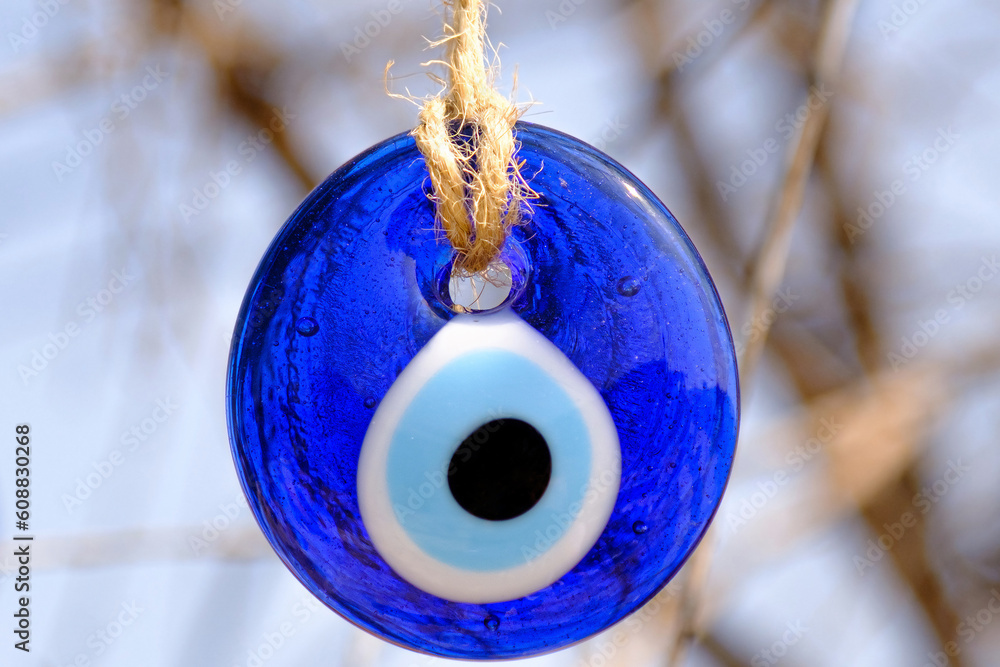 Good luck amulet hanging on the branches of a tree to protect against the evil eye, evil eye bead, macro shot of an amulet. Turkish culture traditional faith symbol.