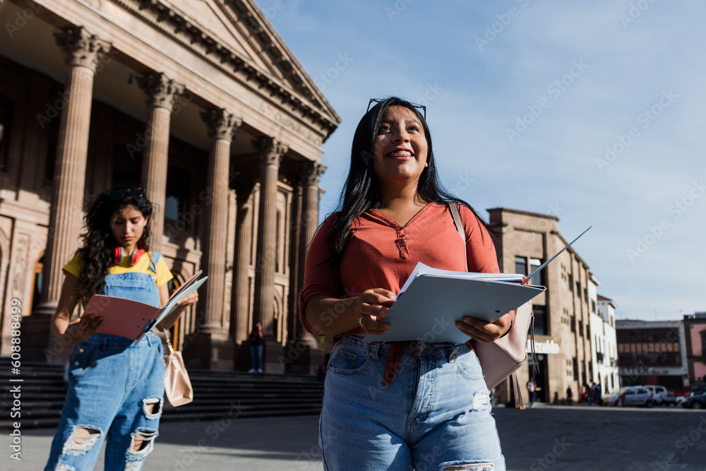 portrait of young latin woman with dental braces university student in Mexico Latin America, hispanic girl studying and holding books