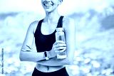 Woman is outdoor with water bottle, fitness and break after training, health and hydration with mockup space. Female athlete smile, workout and exercise in nature with h2o drink, minerals and liquid