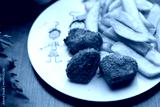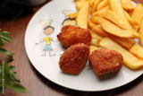 Chicken nuggets with potato fries, on a white plate. Lunch, child portion, selective focus.