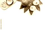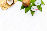 Coconut on green palm leaves with two glasses of fresh cocktail