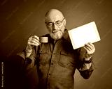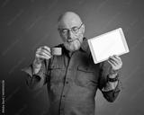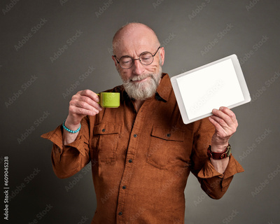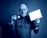 smiling senior man is drinking coffee and showing a blank digital tablet