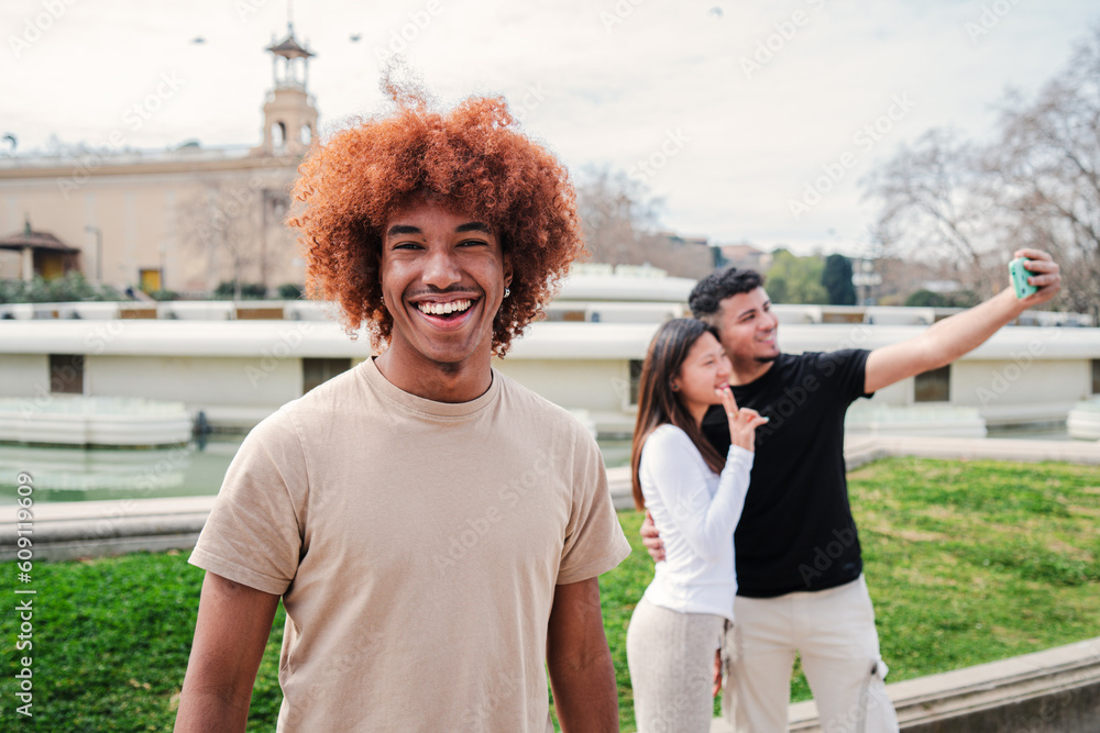 On foreground one joyful african american guy with afro hair looking at camera while his friends do a selife. Young student man smiling at background a couple taking a photo. Teenager male laughing