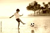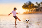 Kids play football on tropical beach at sunset