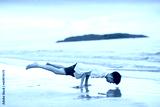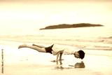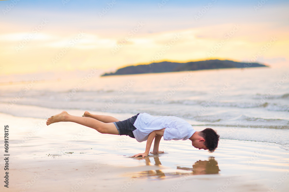 Teenager doing calisthenics exercise. Beach yoga.