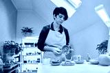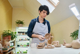 woman forming clay cup shape by hands, closeup in artistic studio
