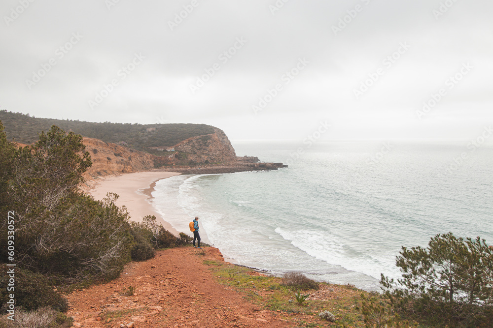 Hiker stands on the edge of a cliff and watches the beach below called Praia do Burgau on the southwest coast of Portugal in the touristic and famous Algarve region. Fisherman Trail