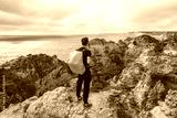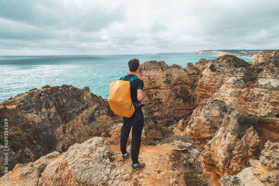 Adventurer with a backpack stands on the edge of a cliff and observes the beautiful group of yellow-gold rocks of Punta de la Piedad in Lagos, in the Algarve region of southern Portugal