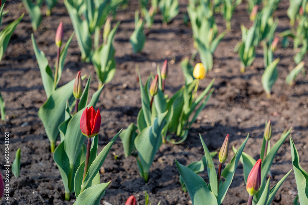 Tulips in the garden on a summer day.Flowers in a flower bed in the park.