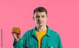 Successful young man showing unlimited gold credit card on pink studio.