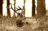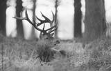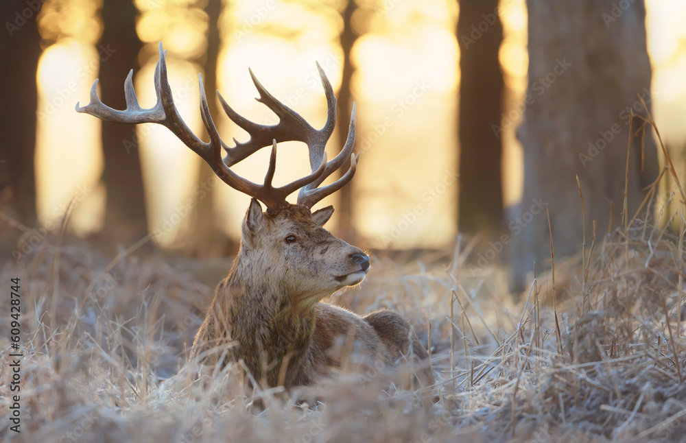 Red Deer stag laying on frosted grass in winter at sunrise