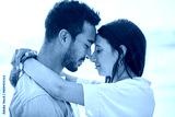 Couple, forehead touch and hug with love and travel, sun and sea with care on vacation in Mexico. Commitment, support and trust in relationship, tourism and people embrace with peace and affection