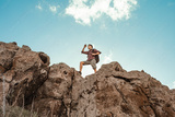 Man getting ready to climb up mountain looking up at the challenge before him. Believe in yourself, overcoming challenges, pushing forward concept.