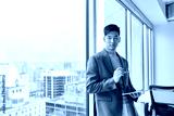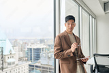 Young pensive Asian business man professional manager executive leader holding digital tablet standing in corporate office looking at window with city view, thinking of solution, lost in thoughts.