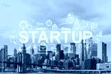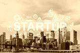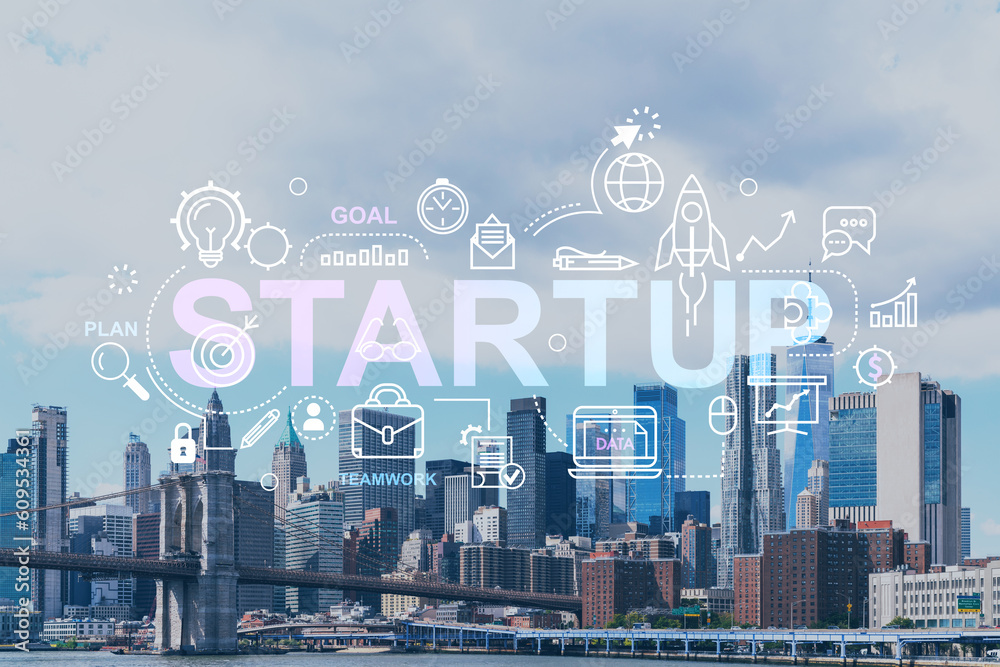 Brooklyn bridge with New York City Manhattan, financial downtown skyline panorama at day time over East River. Startup company, launch project to seek and develop scalable business model, hologram