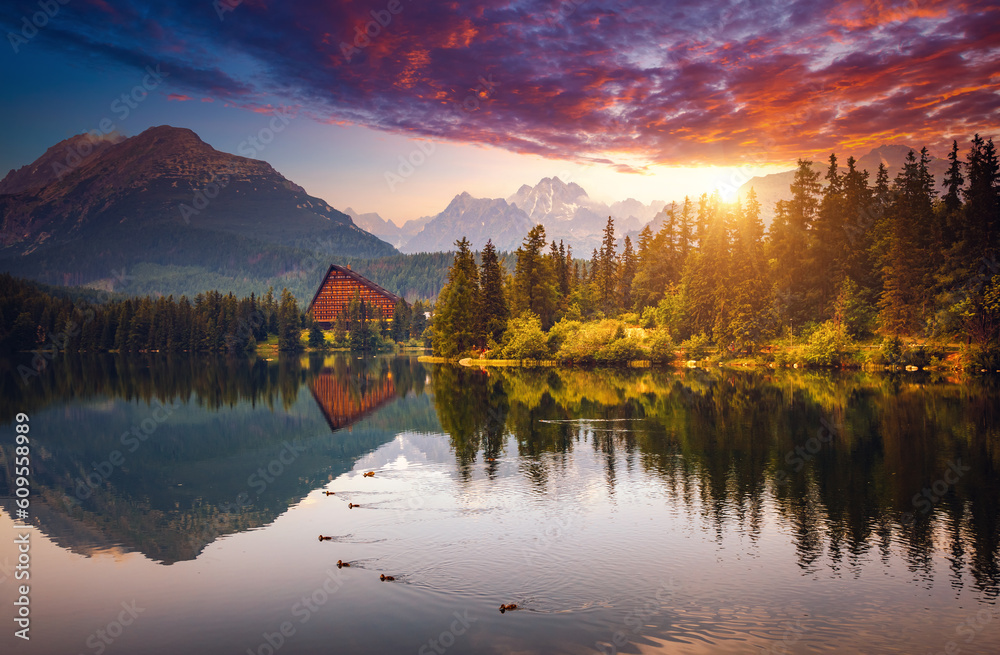 A fabulous evening view of calm lake Strbske pleso, surrounded by mountains. National Park High Tatra, Slovakia, Europe.