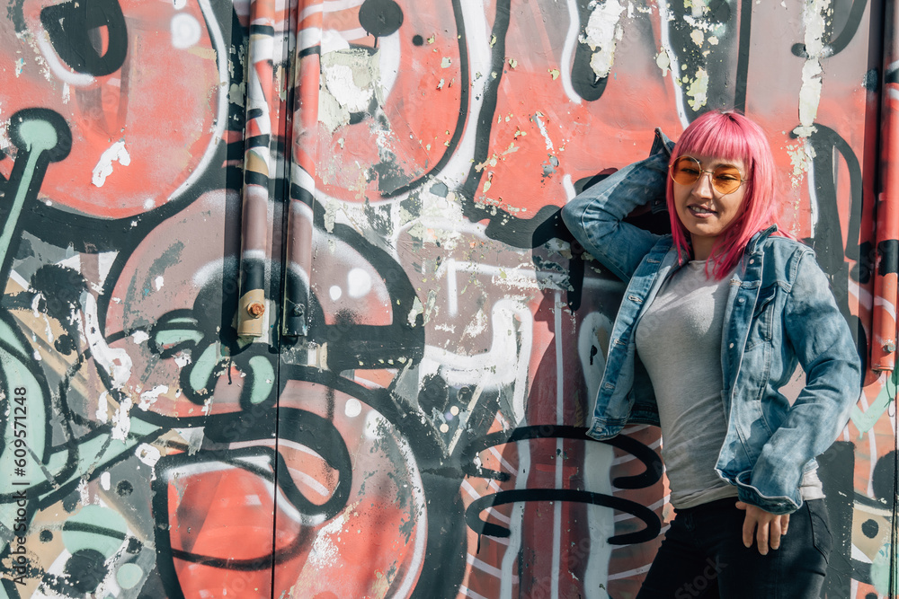 pink hair urban young woman leaning on wall