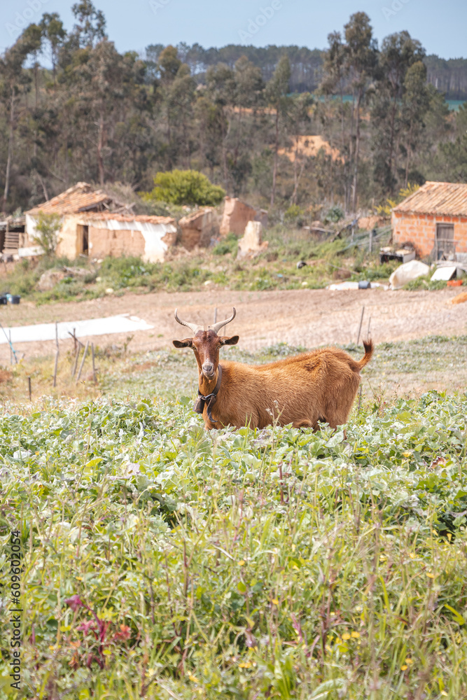 Brown goat looks directly into the lens and considers whether or not it is being threatened. Odemira region Portugal