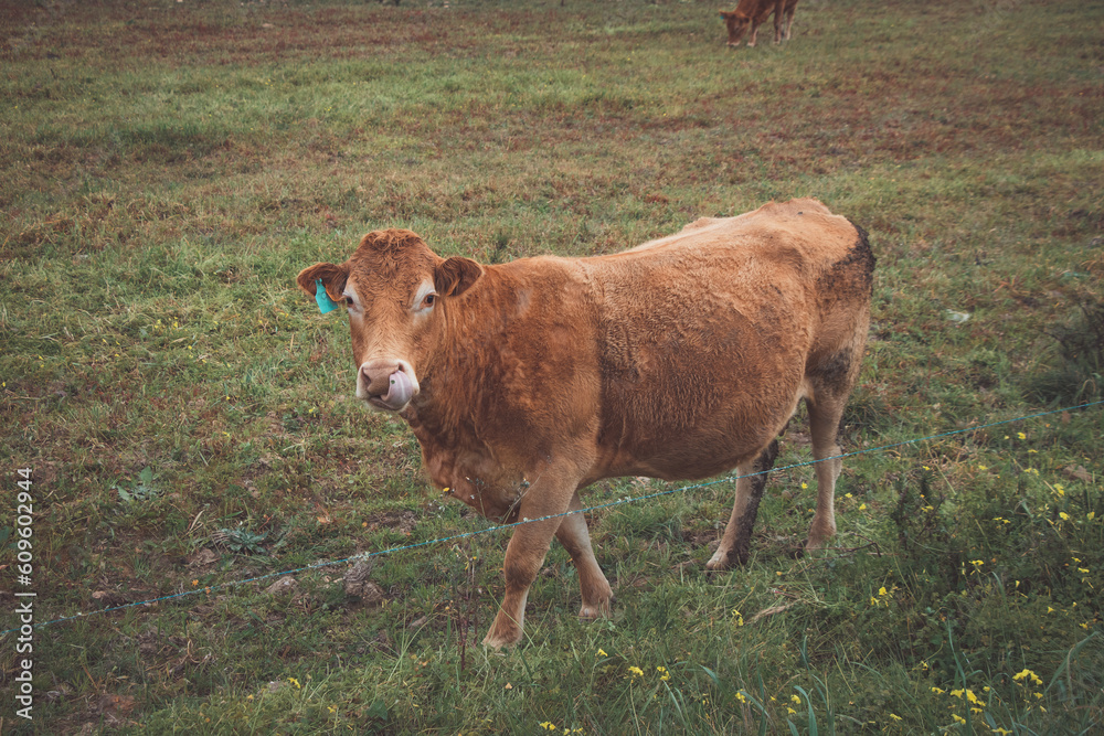 Smiling cow grazing on a green meadow and enjoying the grass without any worries. Organic farm in Portugal. Smiling face. Licking her face