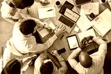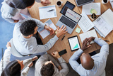 Laptop, planning and teamwork with business people in meeting from above for data, chart and strategy. Project management, budget and report with employees in office for finance, graph and research