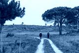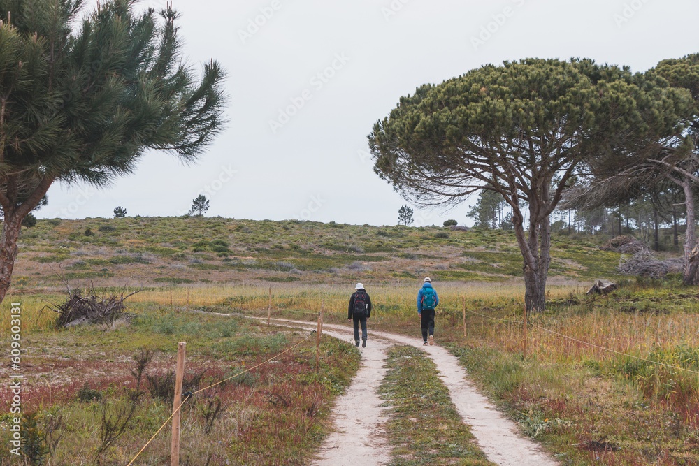 Two travelers walking with a loaded backpack along the trail. Crossing the Fisherman Trail in southwestern Portugal. A multi-day hike