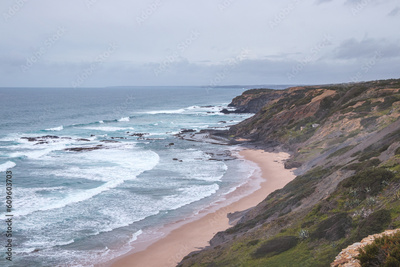 Portugal's western coastline of rocky cliffs and sandy beaches in the Odemira region. Wandering along the Fisherman trail on rainy days
